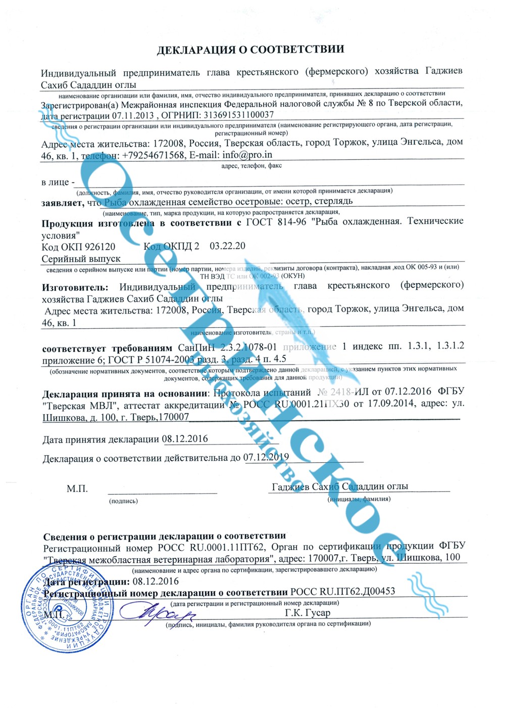 И имеем все наобходимые документы разрешающие нам производство и продажу рыб семейства осетровых.